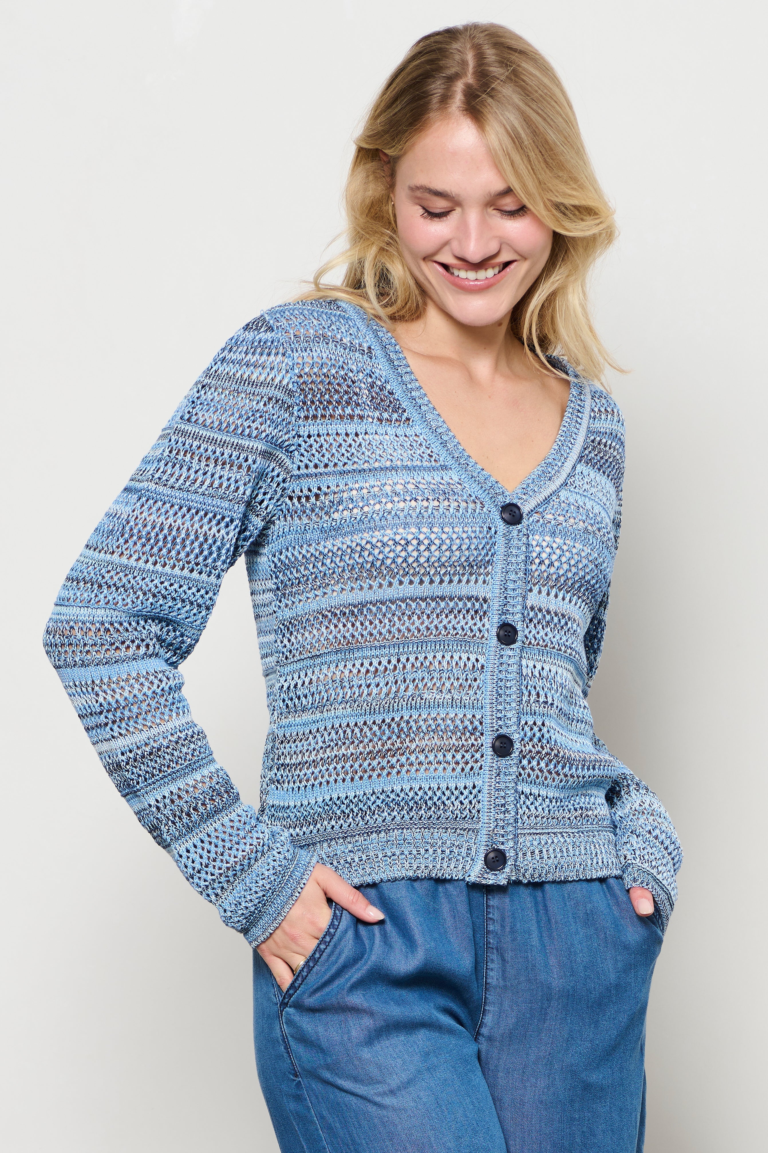 Het Vest Babette Light Blue Multi CA112 van &Co woman heeft een speelse opengewerkte structuur en een frisse kleurencombinatie. De knoopsluiting en V-hals geven het vest een vrouwelijke touch. Perfect om te dragen over een top of blouse voor een casual en stijlvolle look.