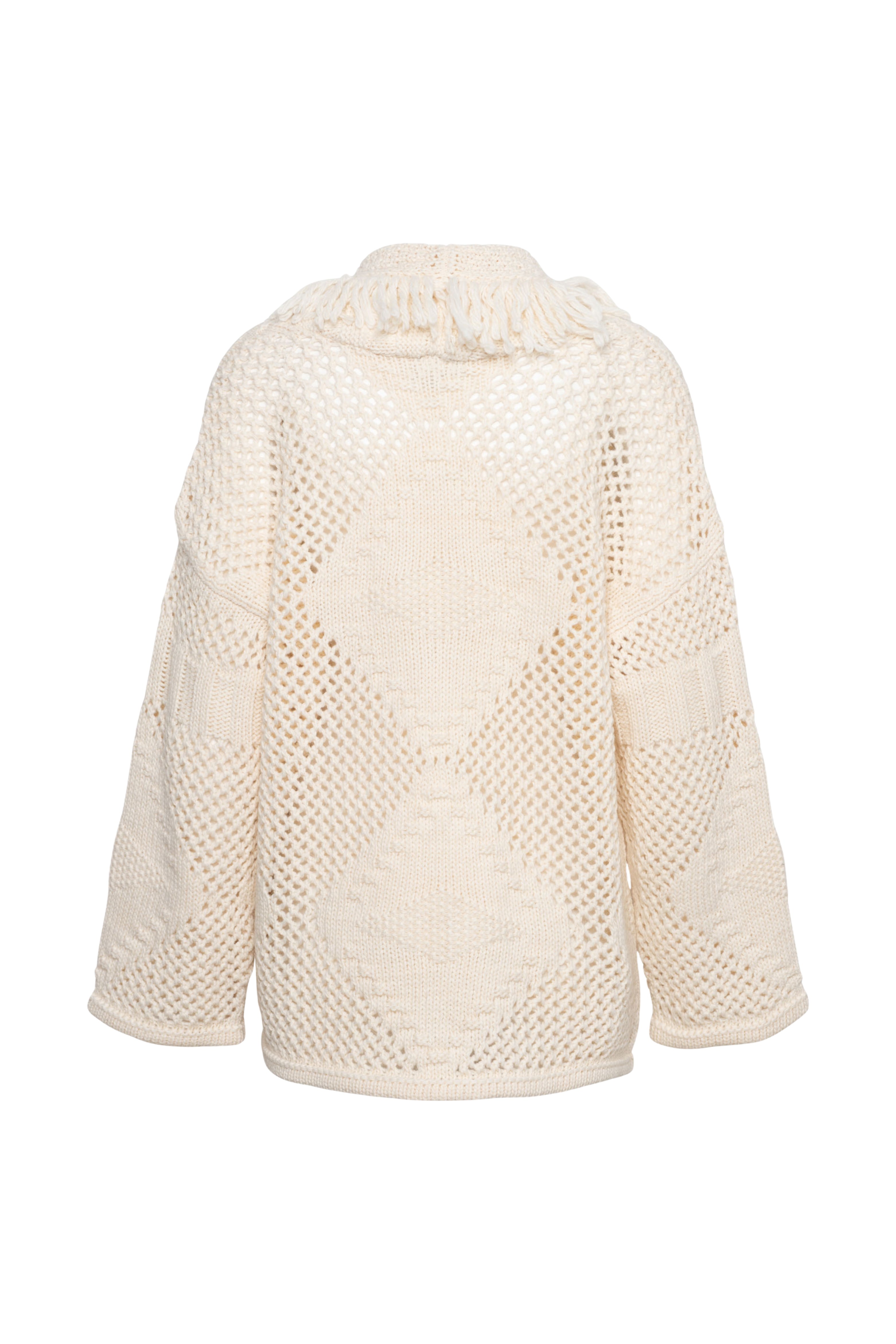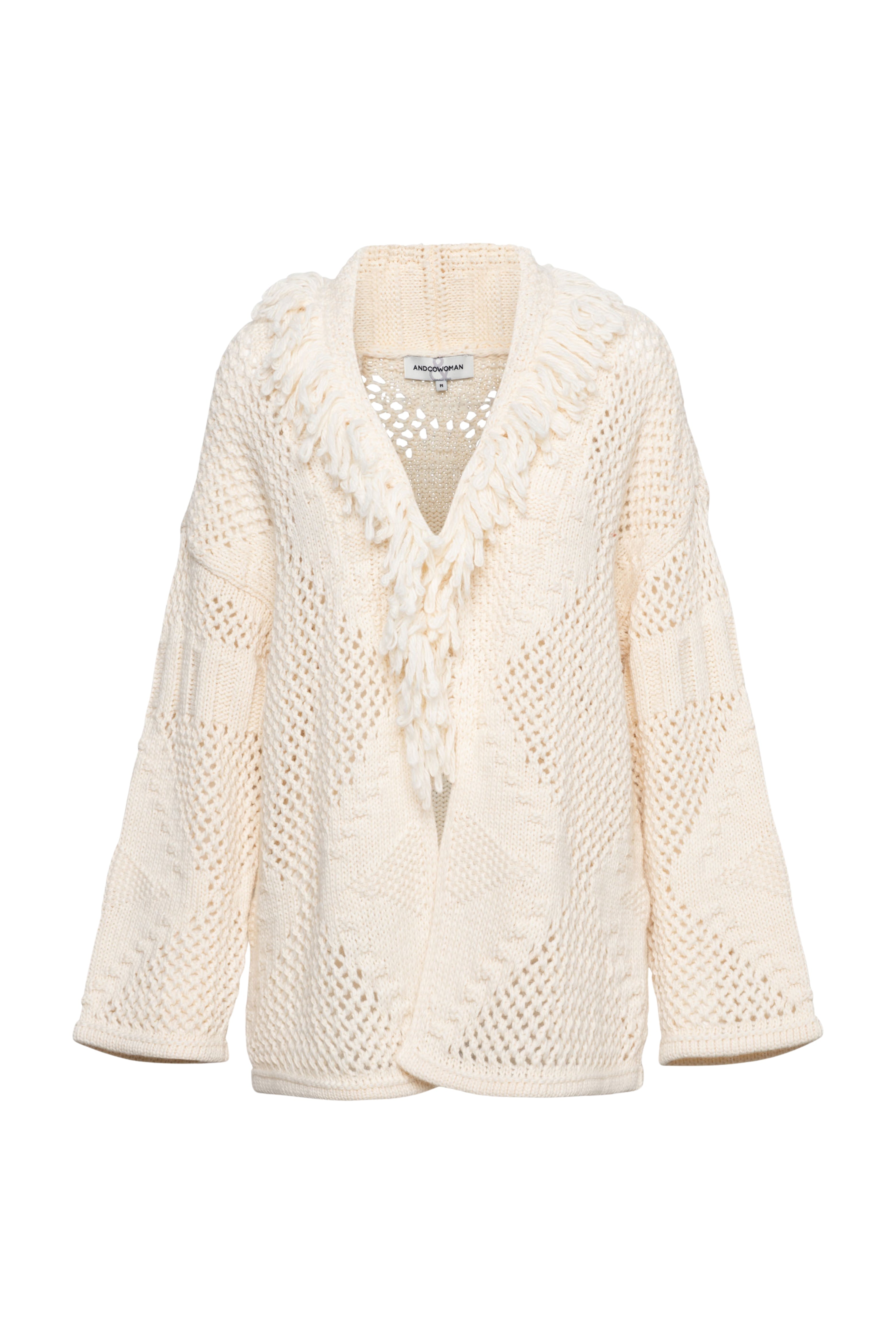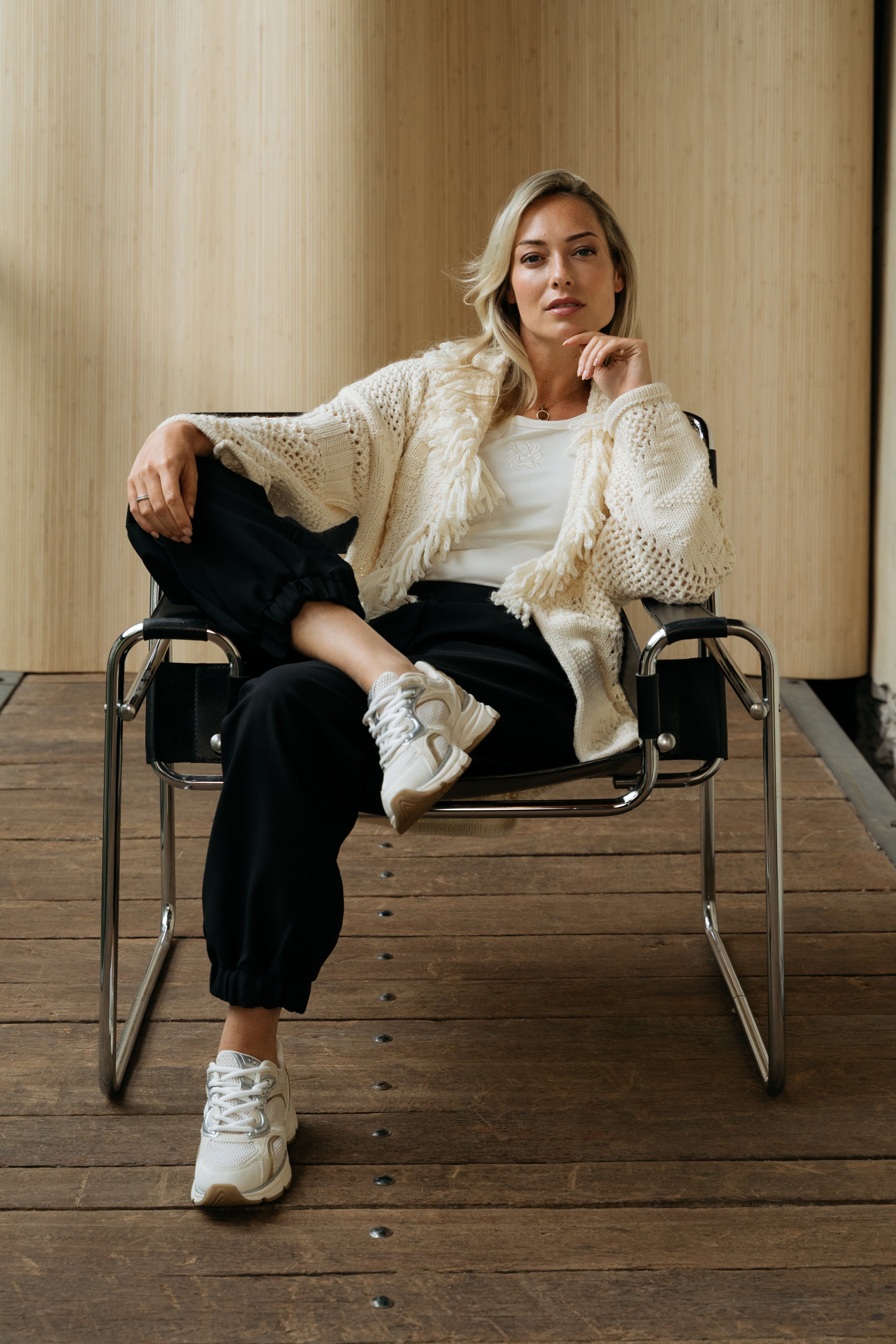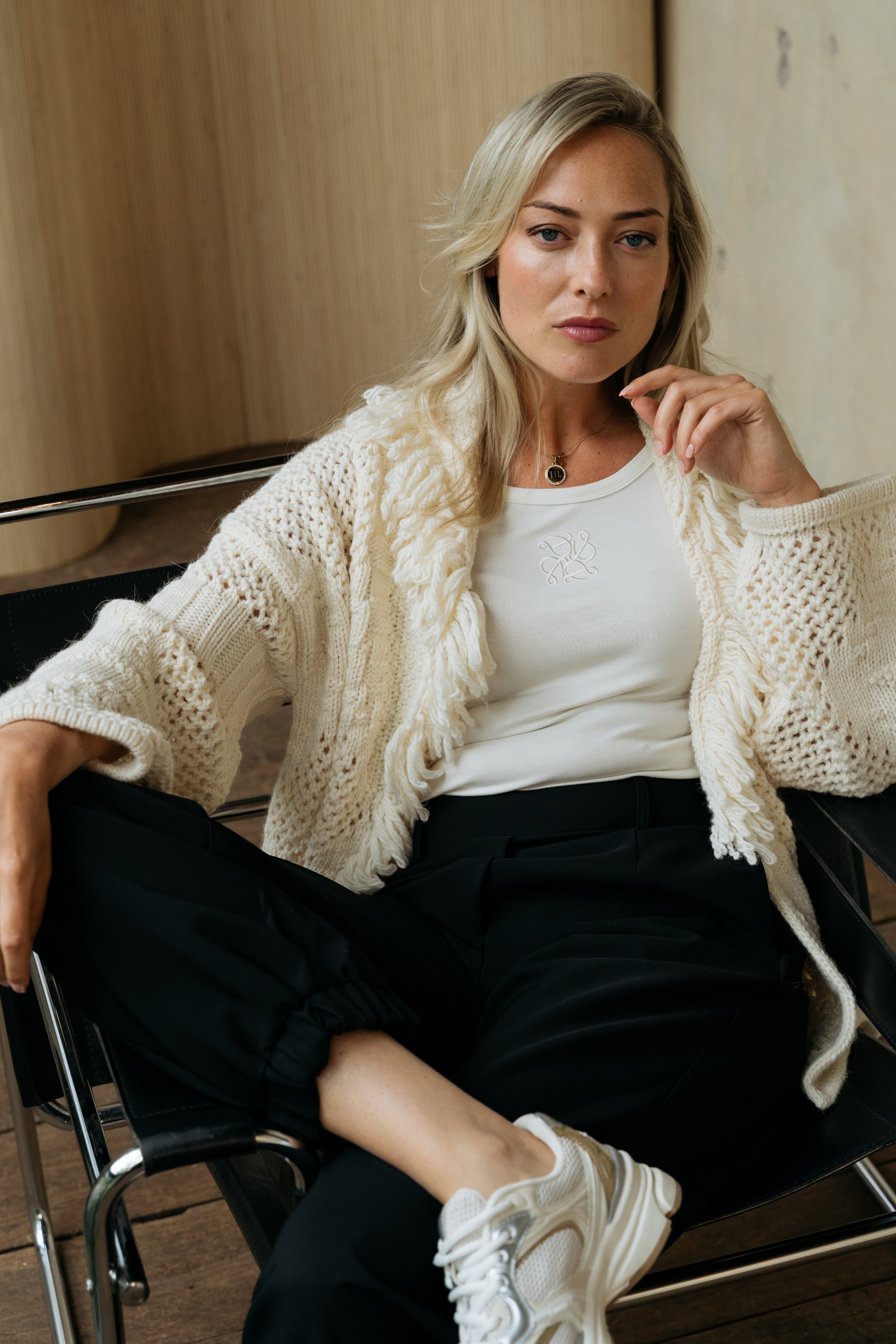 Het Vest Bailey Beige van &Co Woman is een grofgebreid, cozy item met speelse franjes langs de kraag. De luchtige structuur en relaxed fit maken dit vest ideaal voor een nonchalante, maar stijlvolle look.