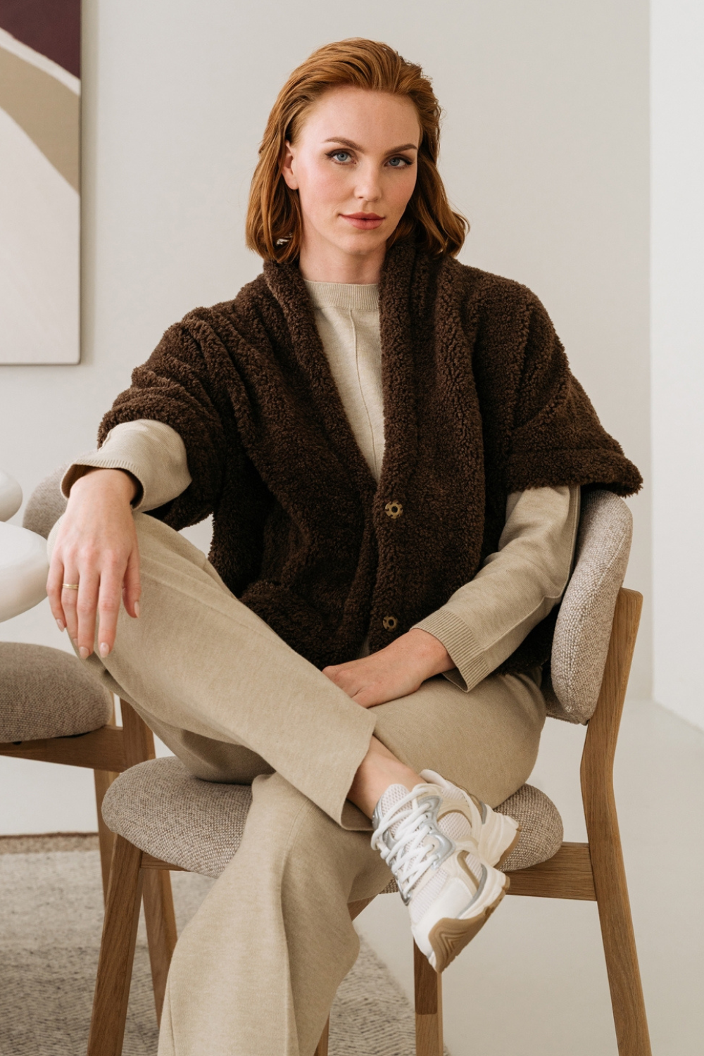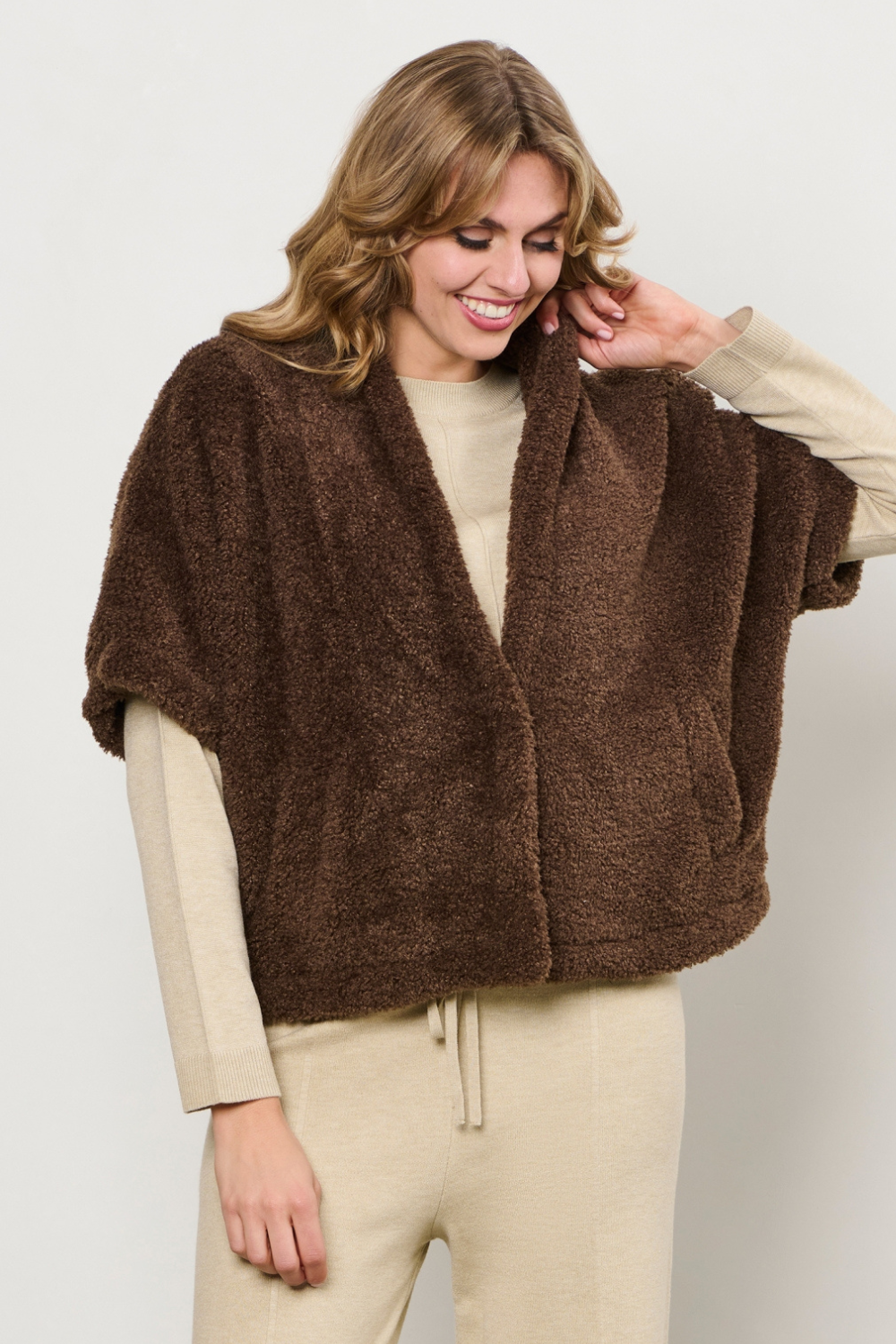 Vest Carly Chocolate van &Co Woman is een comfortabel vest met een teddystructuur. Dit mouwloze model met opstaande kraag, relaxte pasvorm en voering biedt warmte en stijl in รฉรฉn. De diepe chocoladetint geeft een rijke en warme uitstraling aan elke look.
