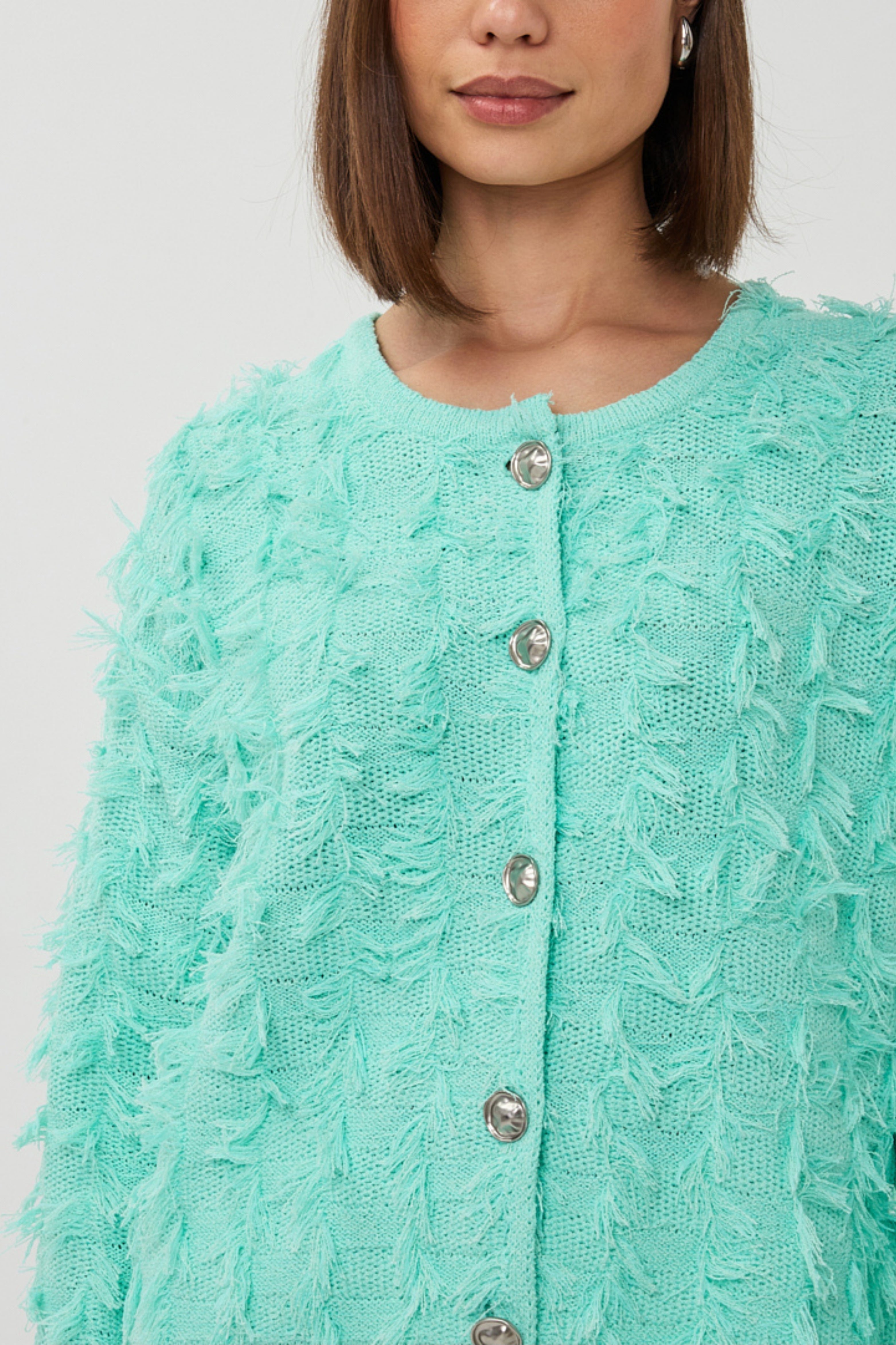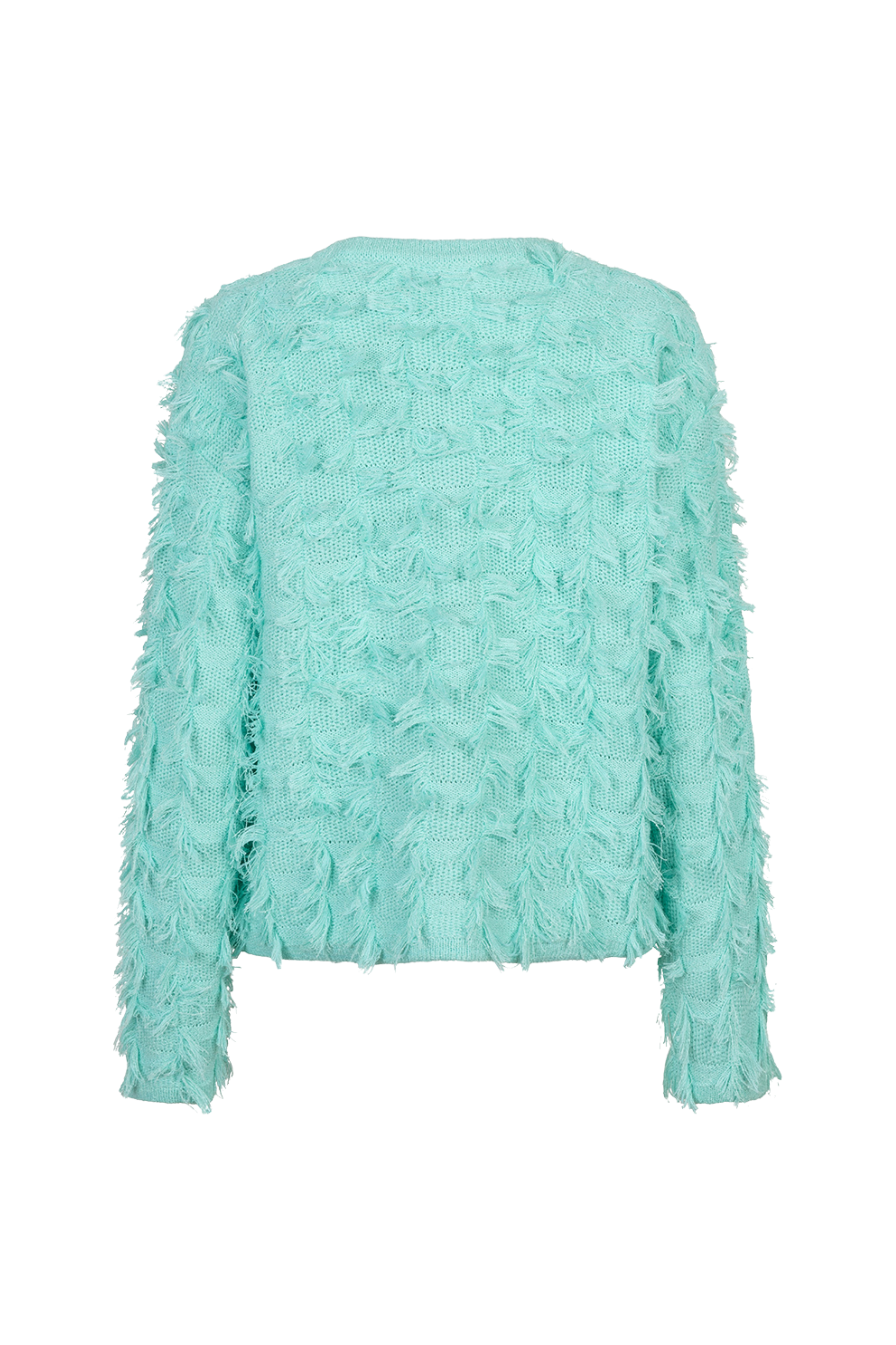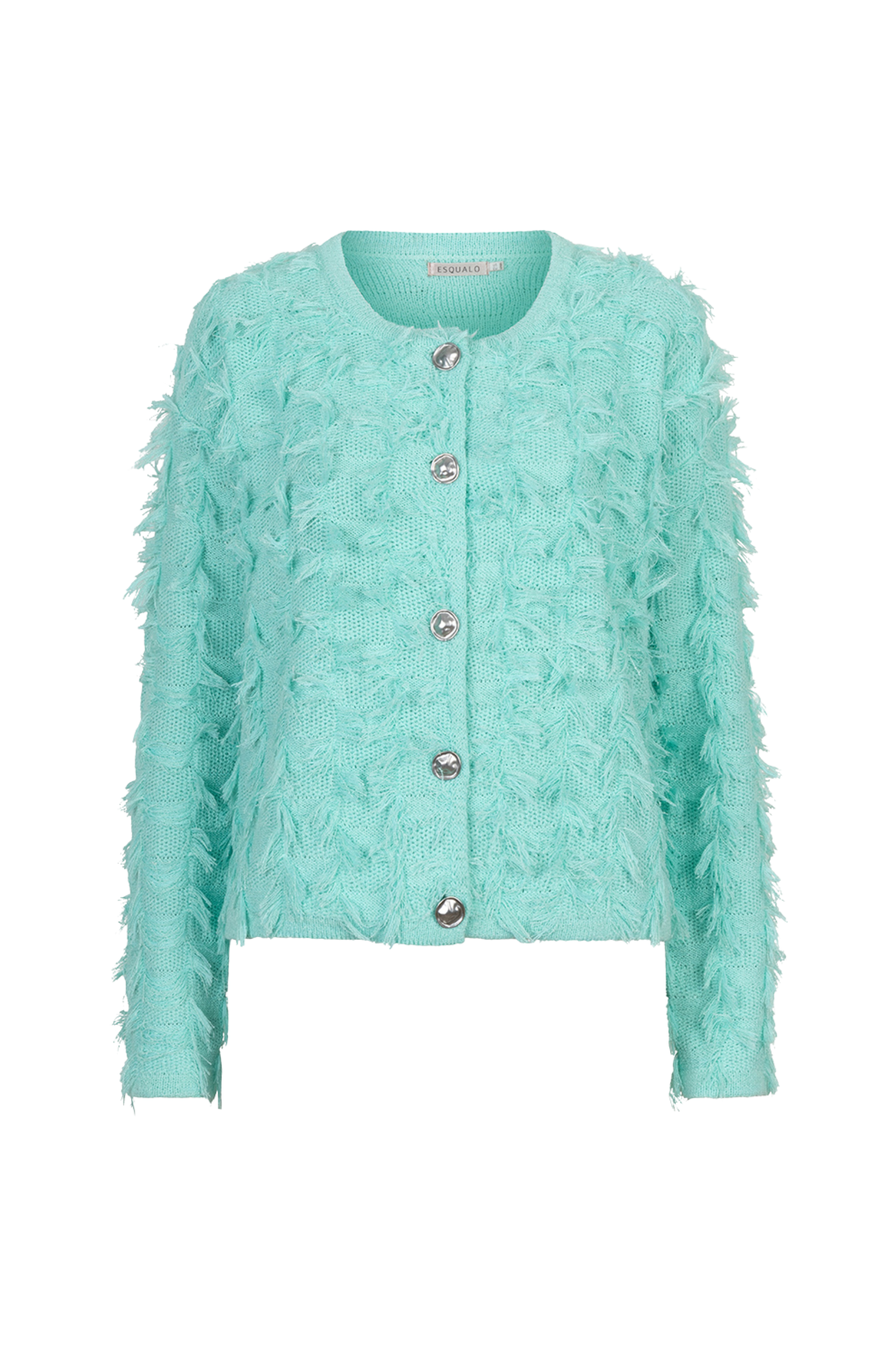Vest Fringes Mint Green van EsQualo is een stijlvol en elegant vest dat je outfit direct een speelse en luxe uitstraling geeft. De opvallende franjes en de zachte mintkleur zorgen voor een modieuze look, perfect om zowel casual als chic te combineren.