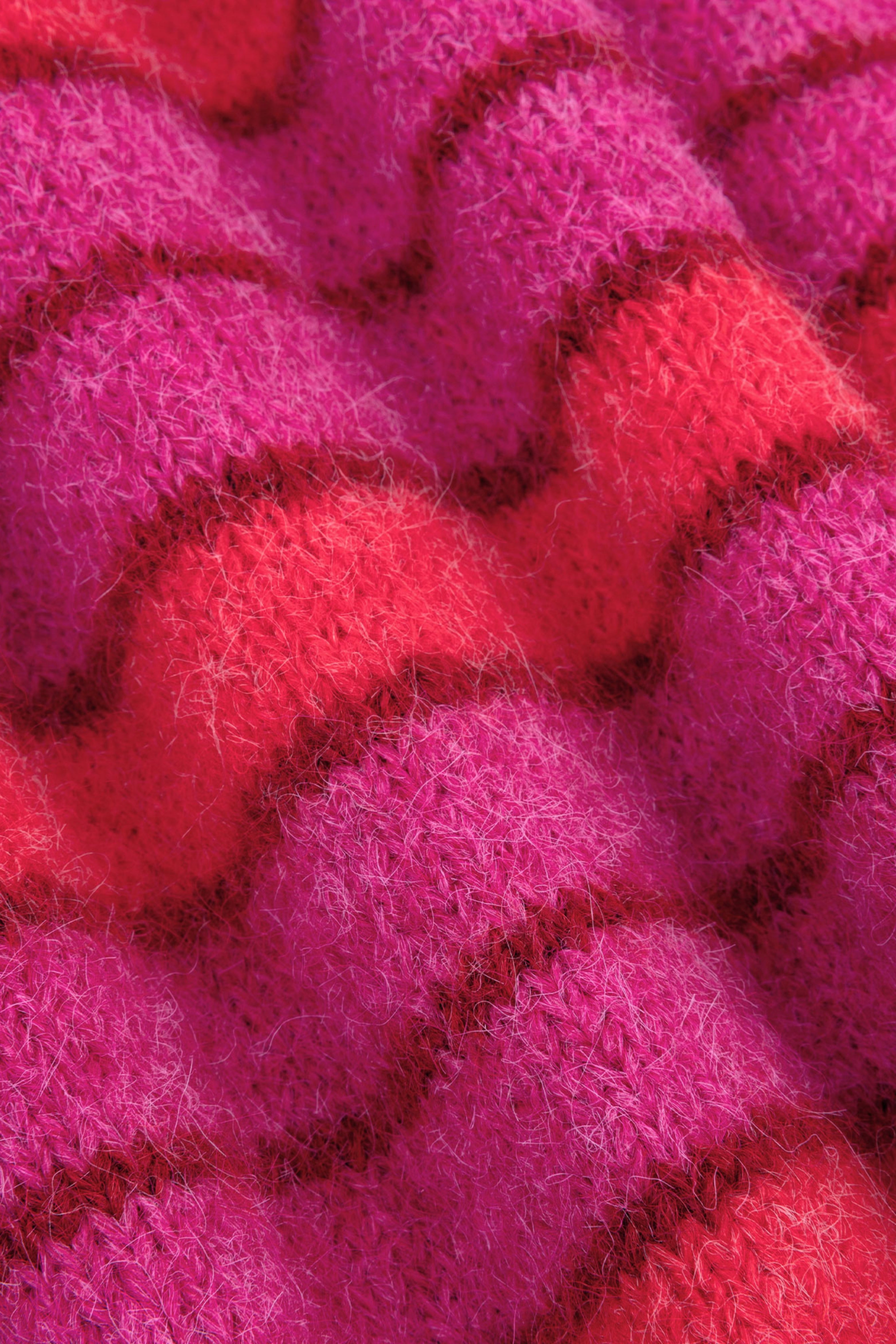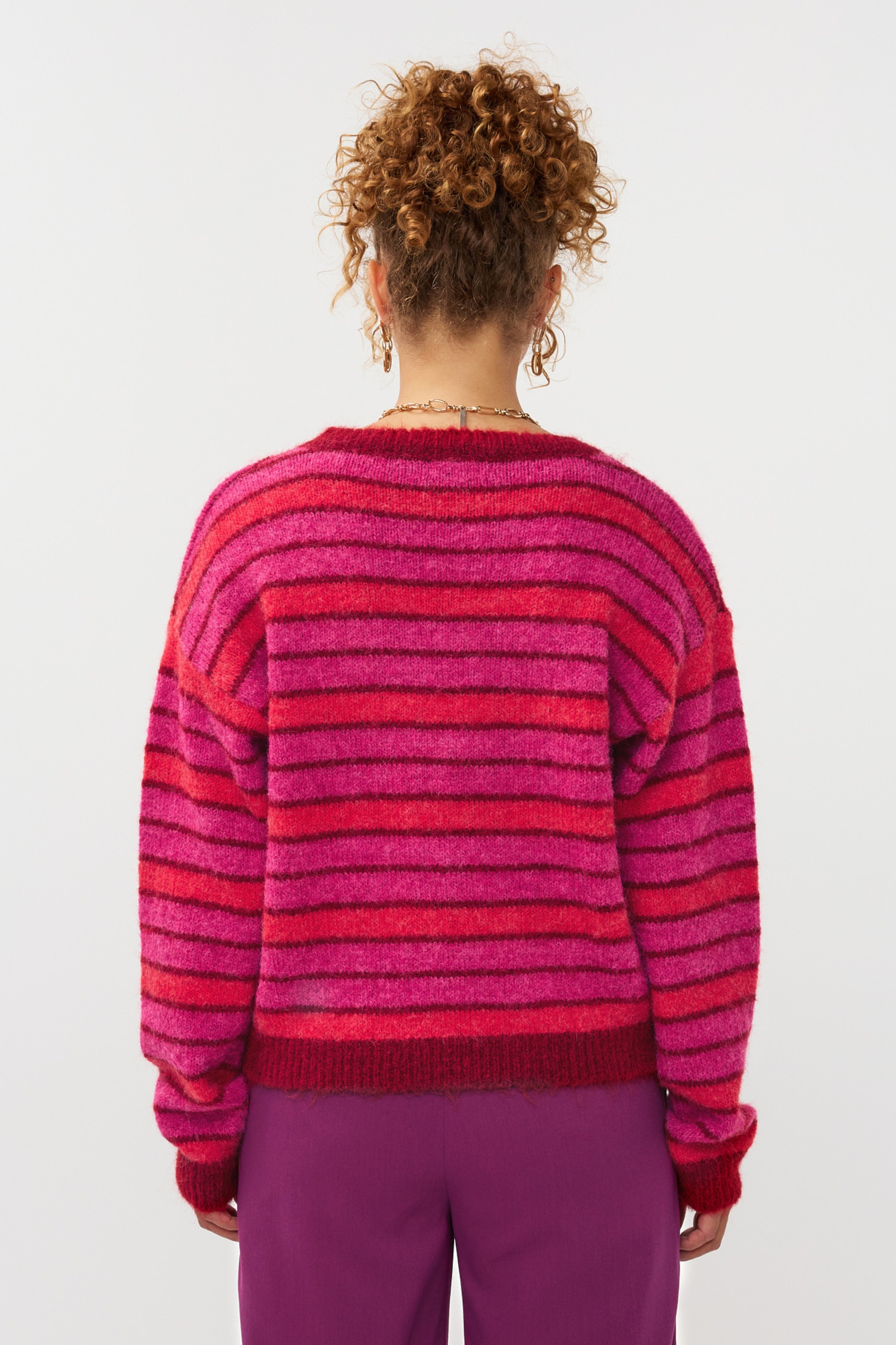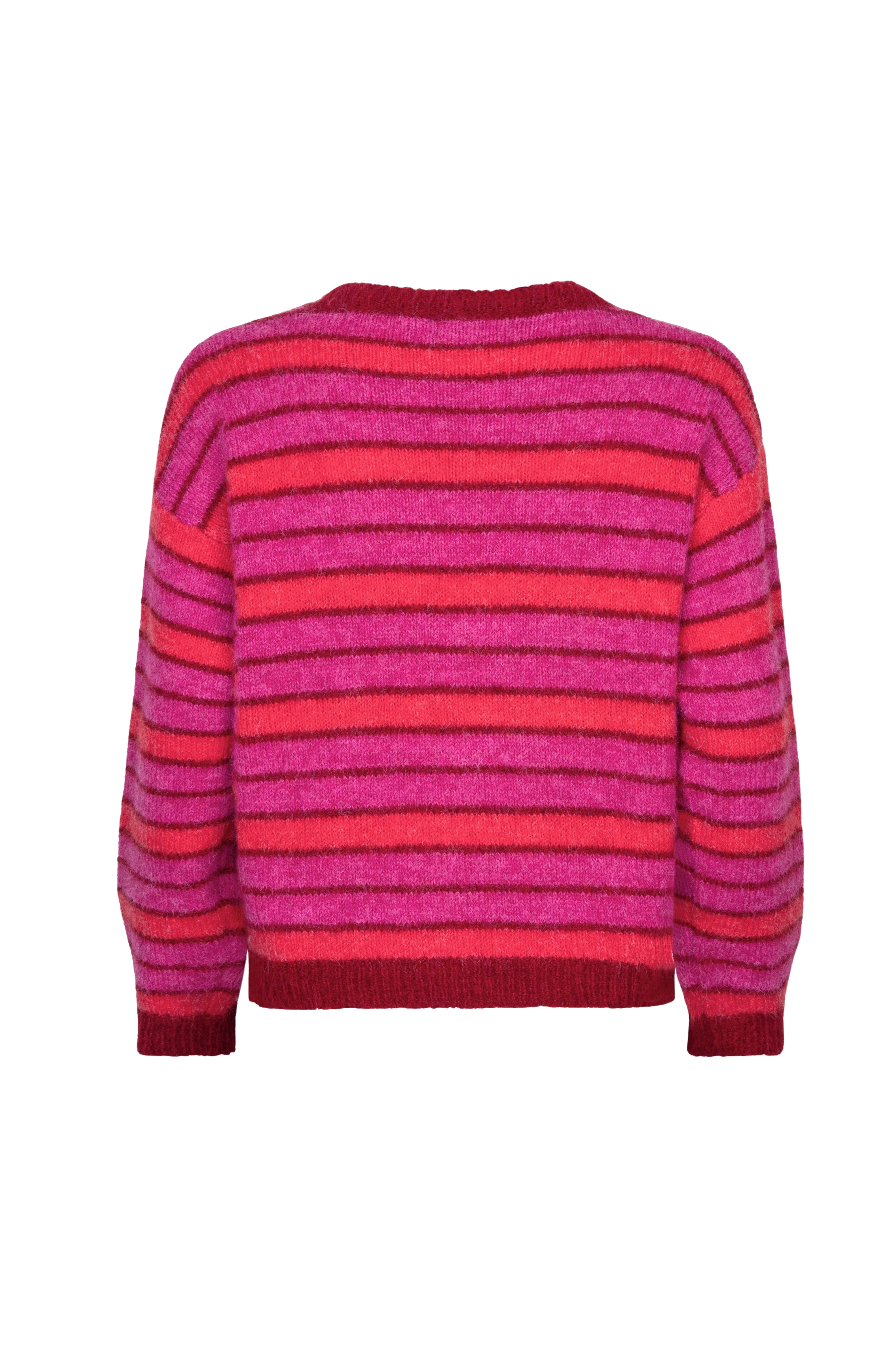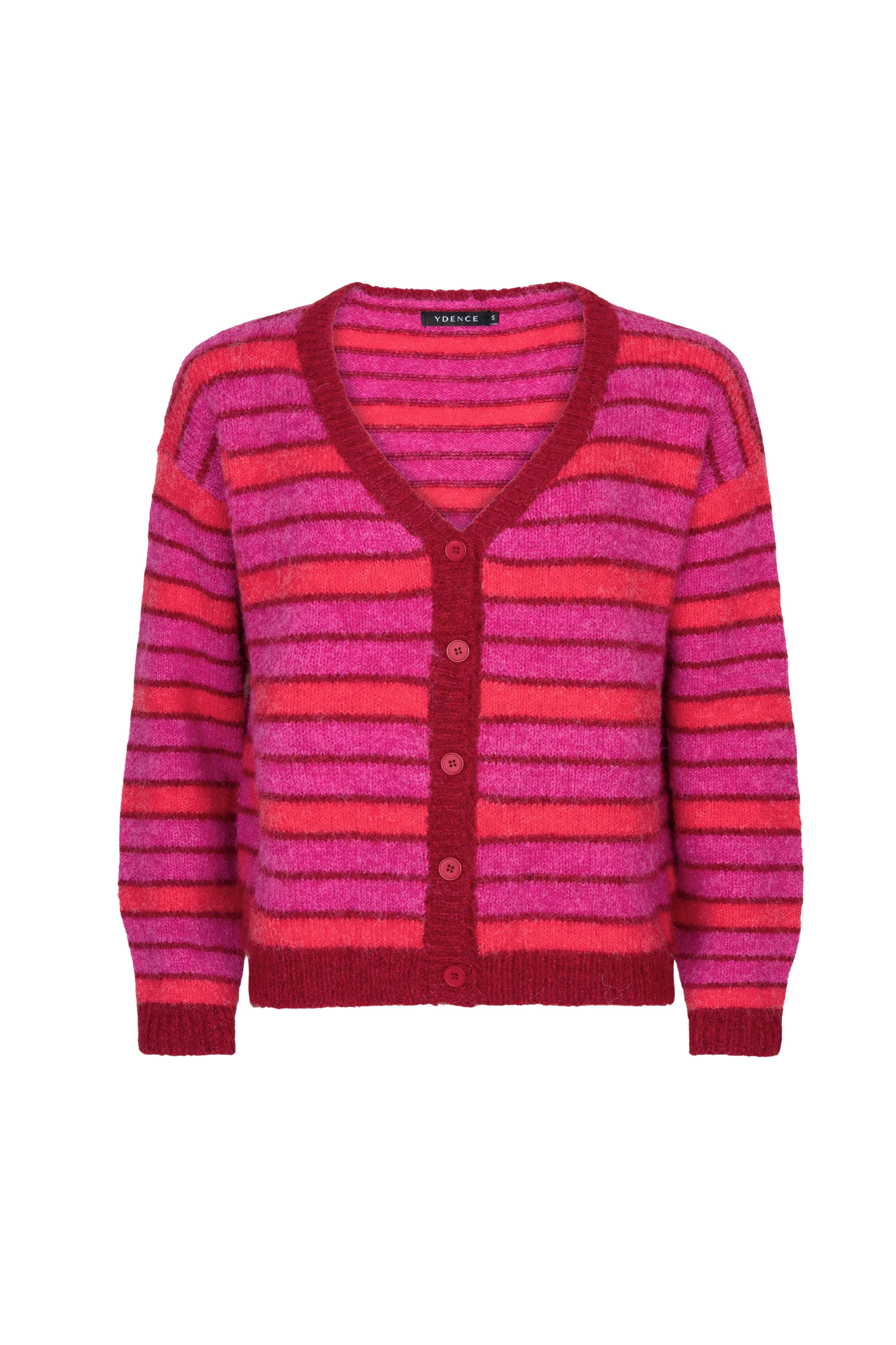 Het Vest Ginny Fuchsia Red van Ydence is een zacht, gebreid vest met een speels streeppatroon in fuchsia en rood. De diepe V-hals, contrasterende knoopsluiting en geribde boorden geven het ontwerp een moderne, cosy uitstraling. Perfect voor laagjeslooks en makkelijk te combineren.