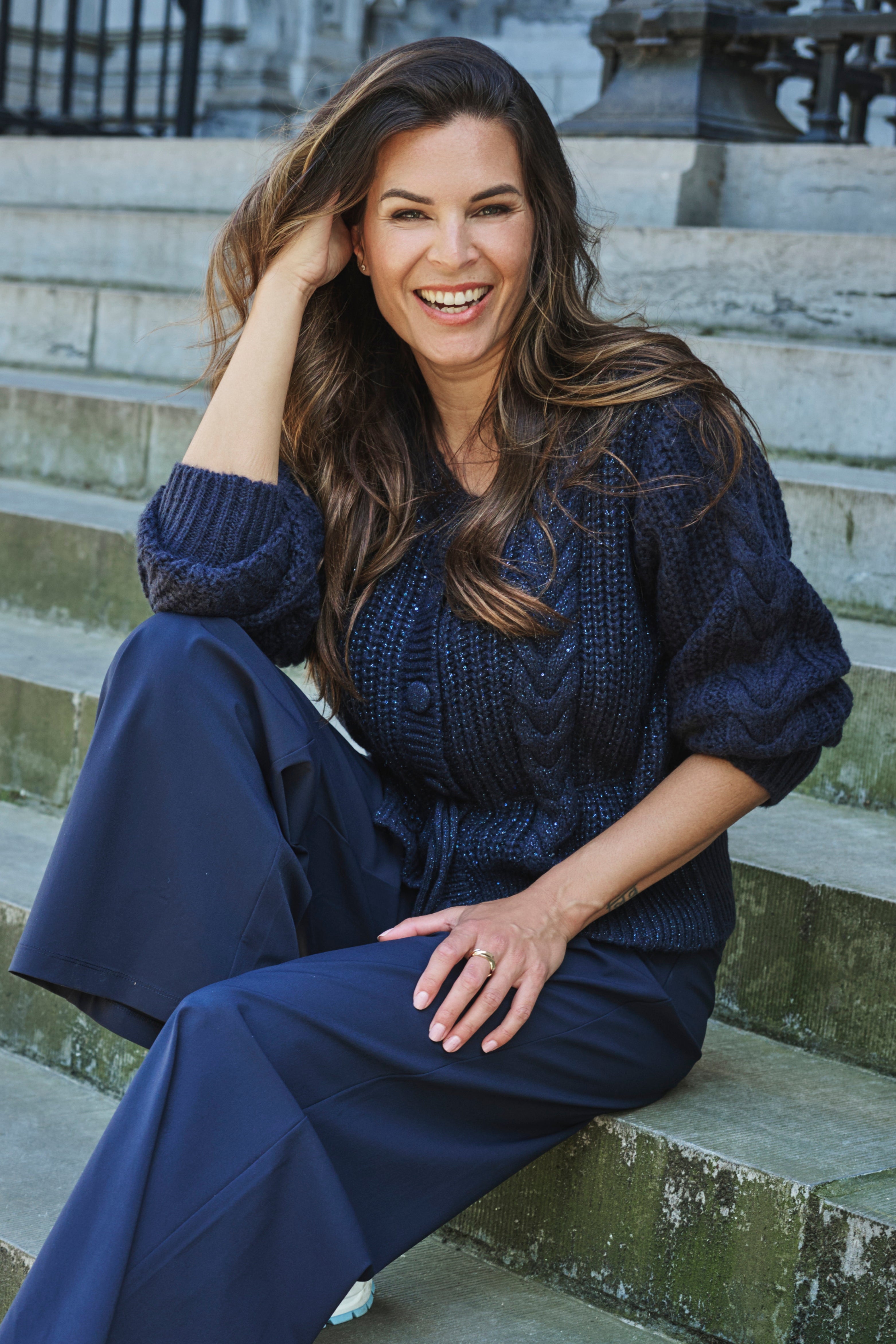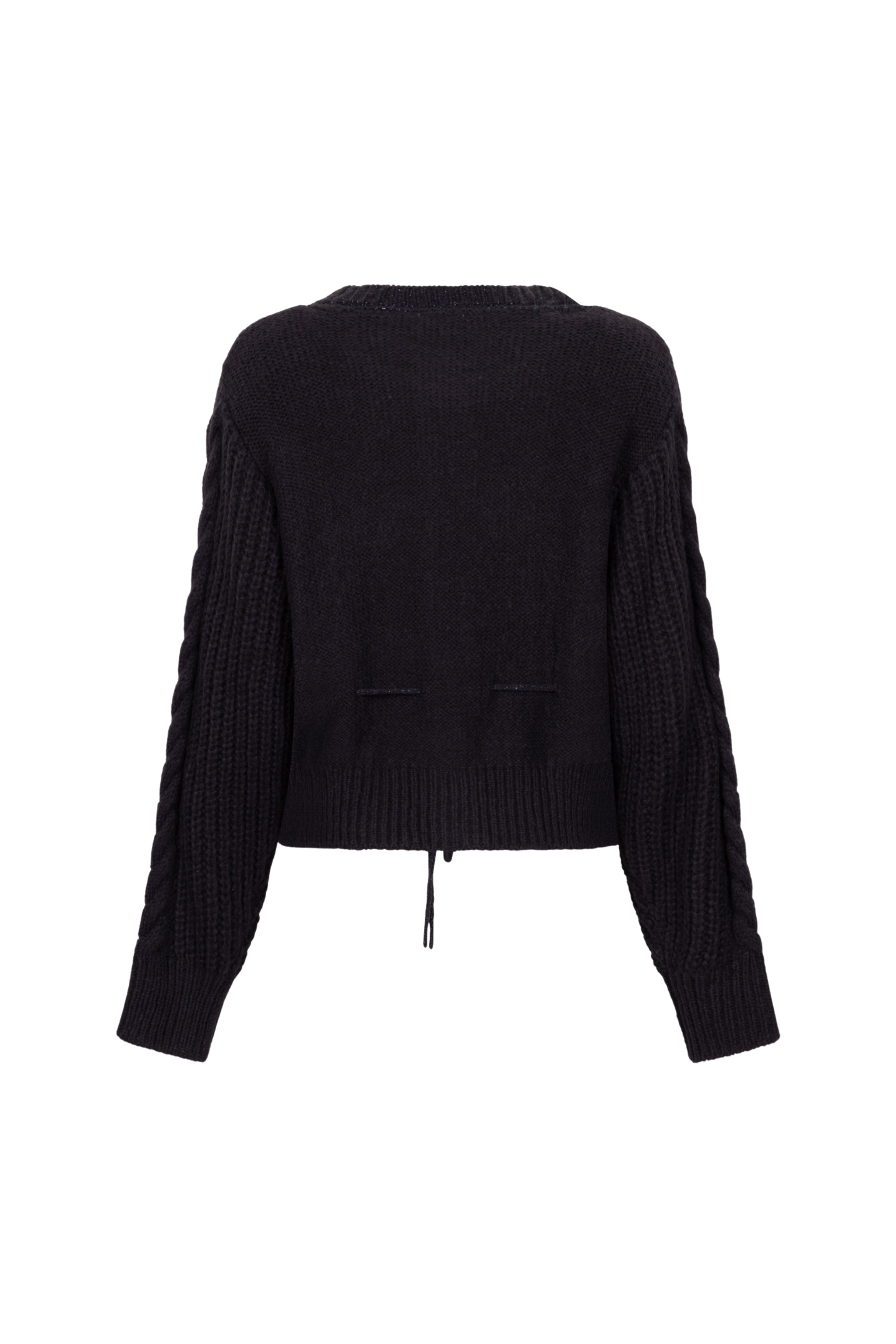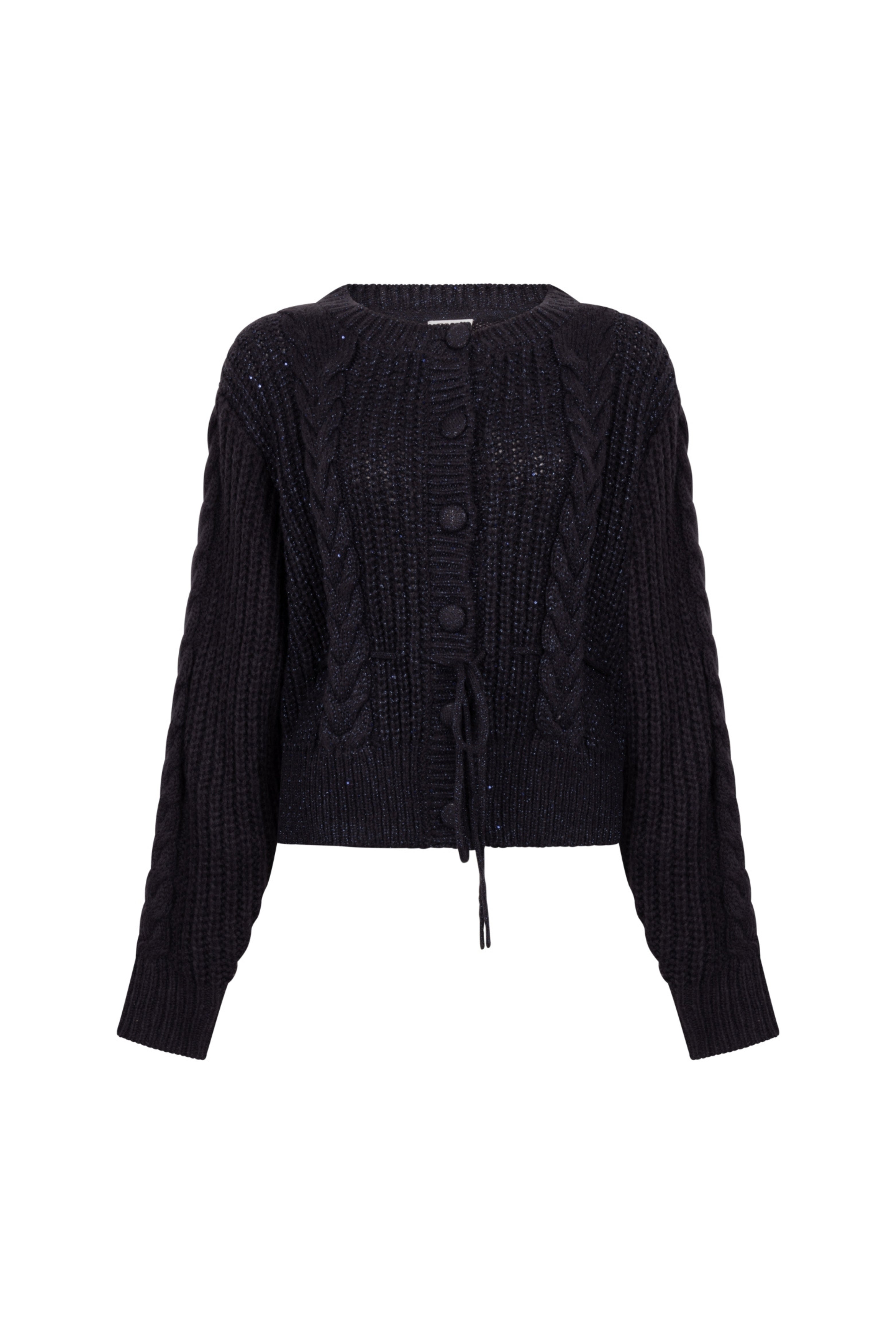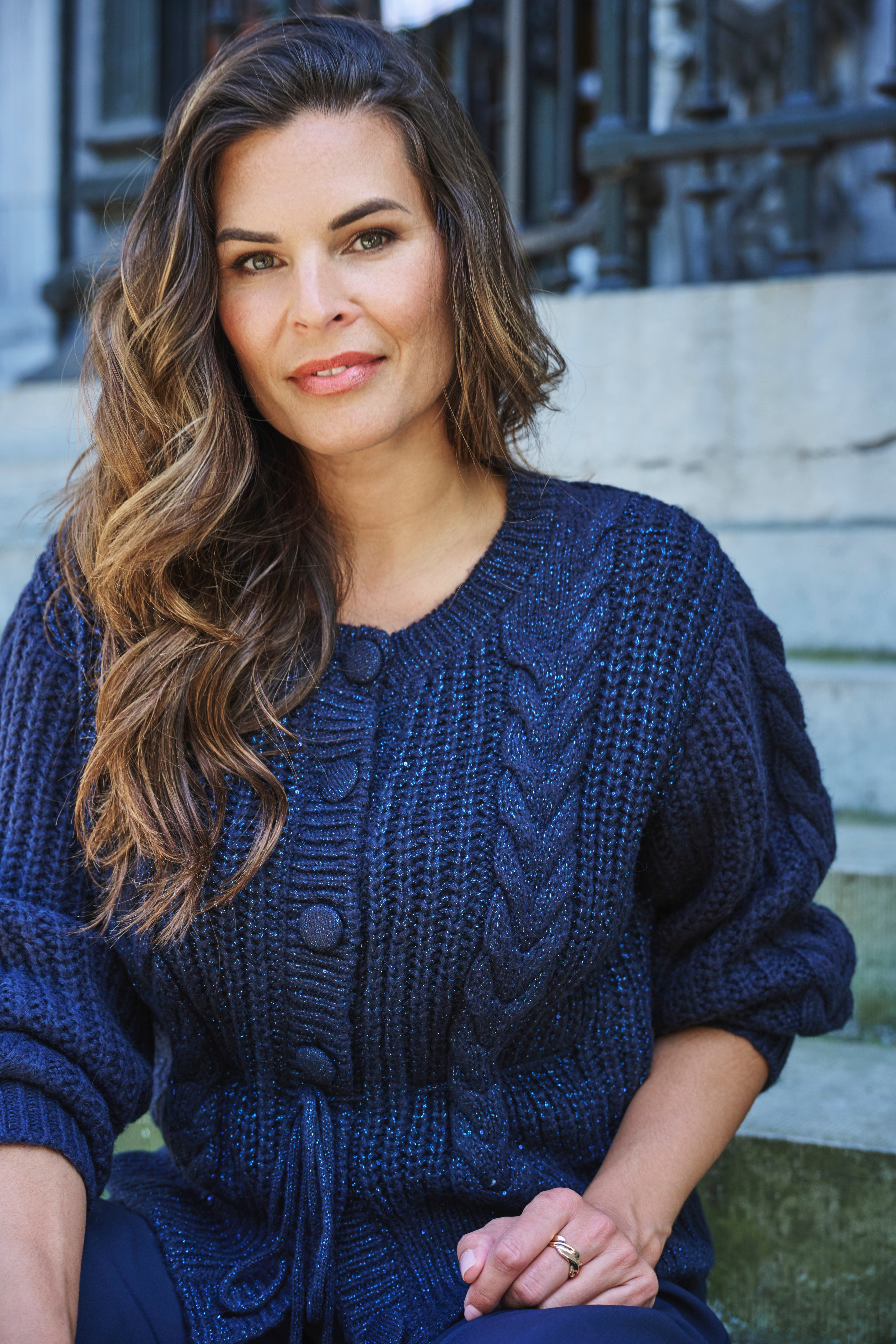 Vest Marloes Navy van Zoso is een kort gebreid vest met grof kabelpatroon en subtiel glanseffect. De ronde hals, beklede knopen en striksluiting in de taille geven een vrouwelijke twist.