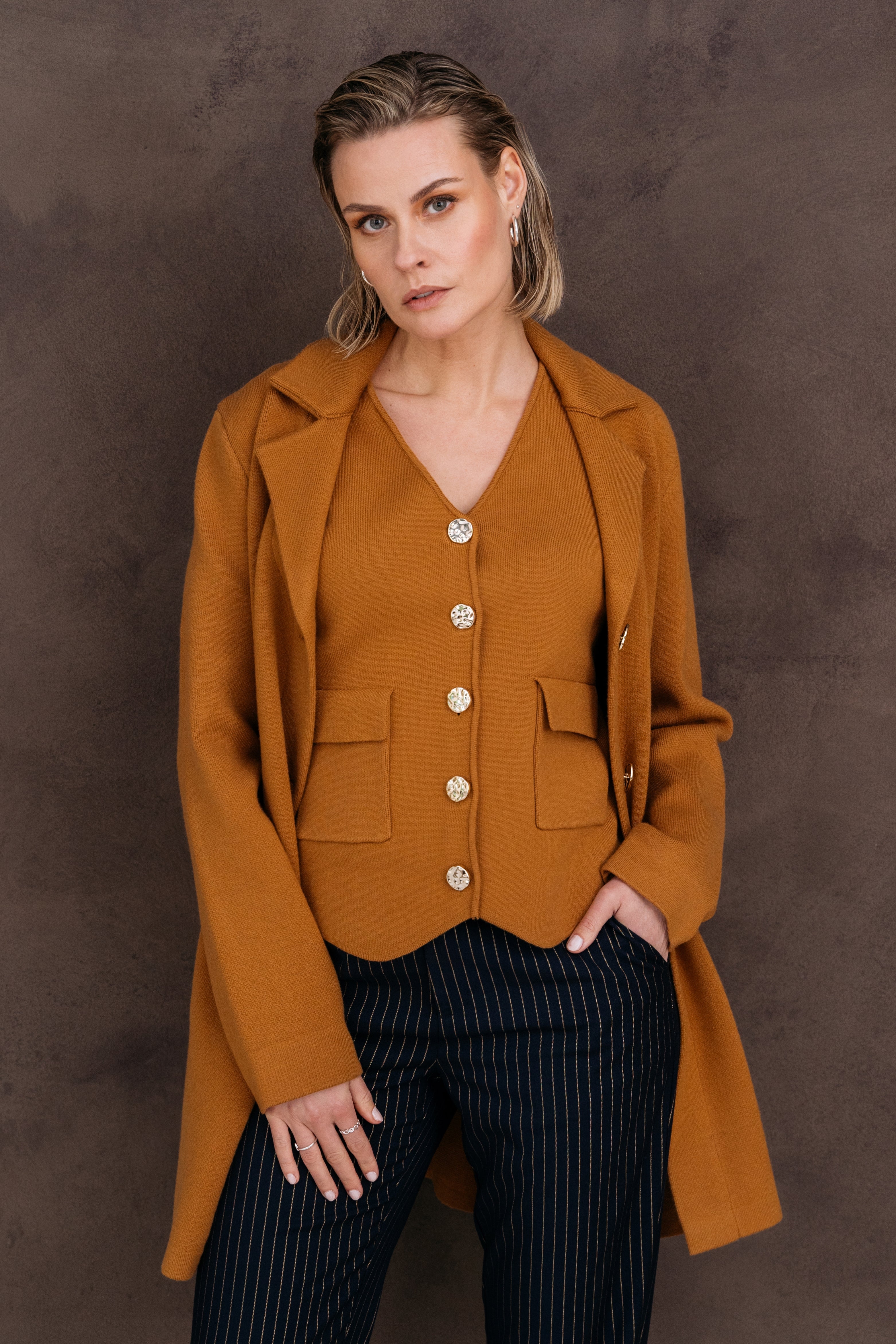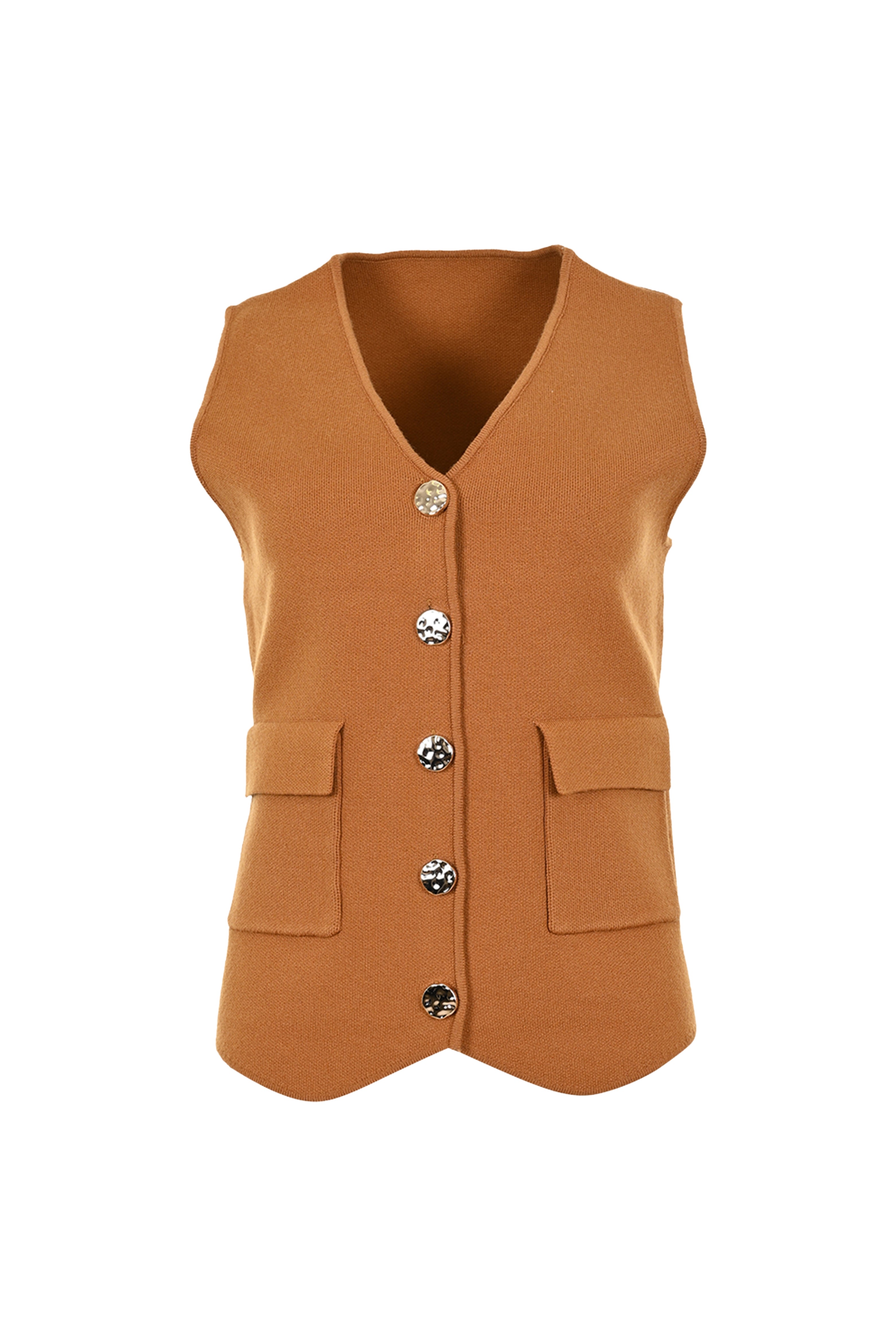 Vest Pessie Apple Cinnamon van Maicazz is een stijlvol mouwloos vest in een warme kaneelkleur. Met elegante knopen en klepzakken aan de voorzijde is dit item perfect te combineren voor een moderne, gelaagde look.