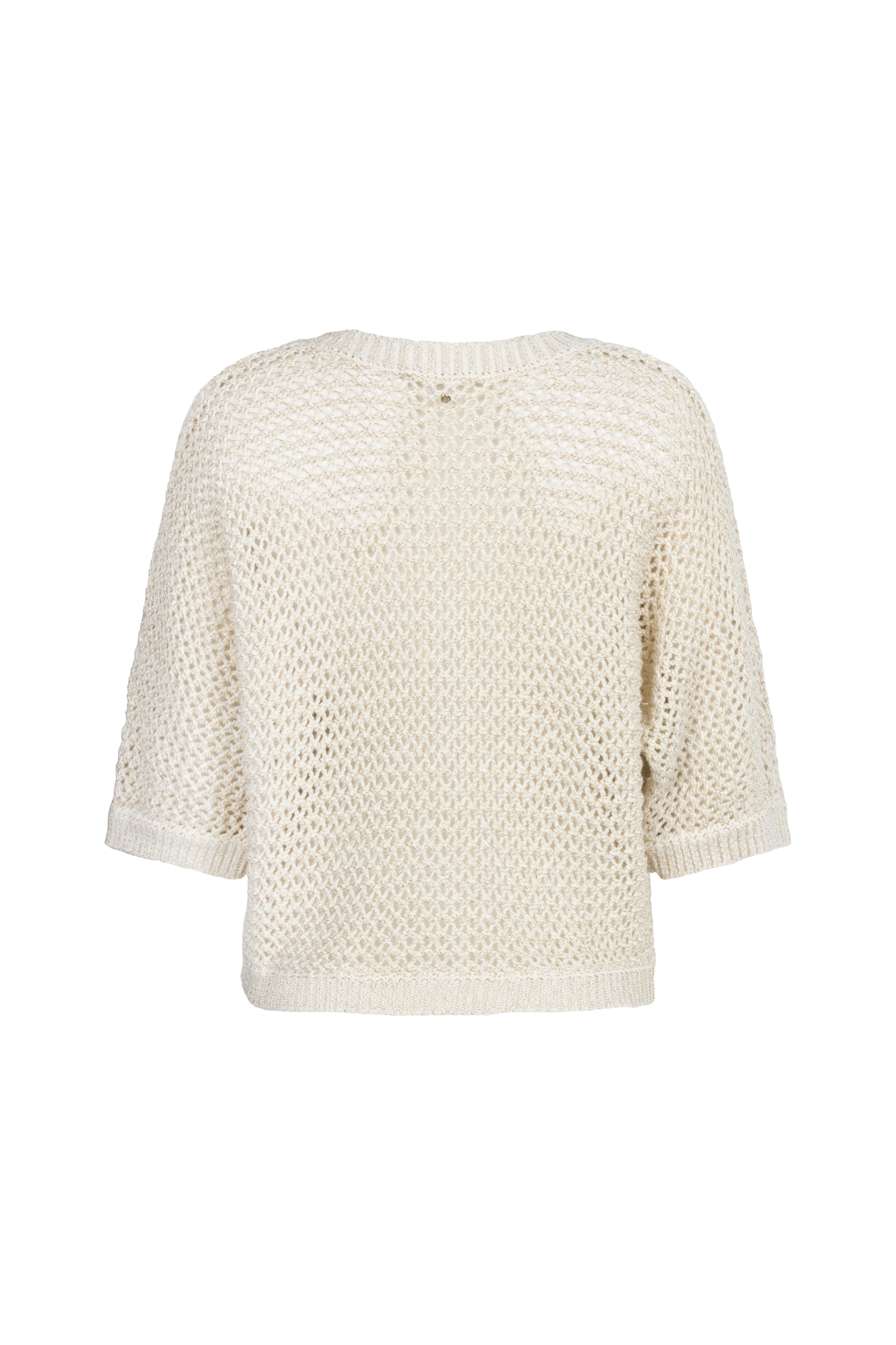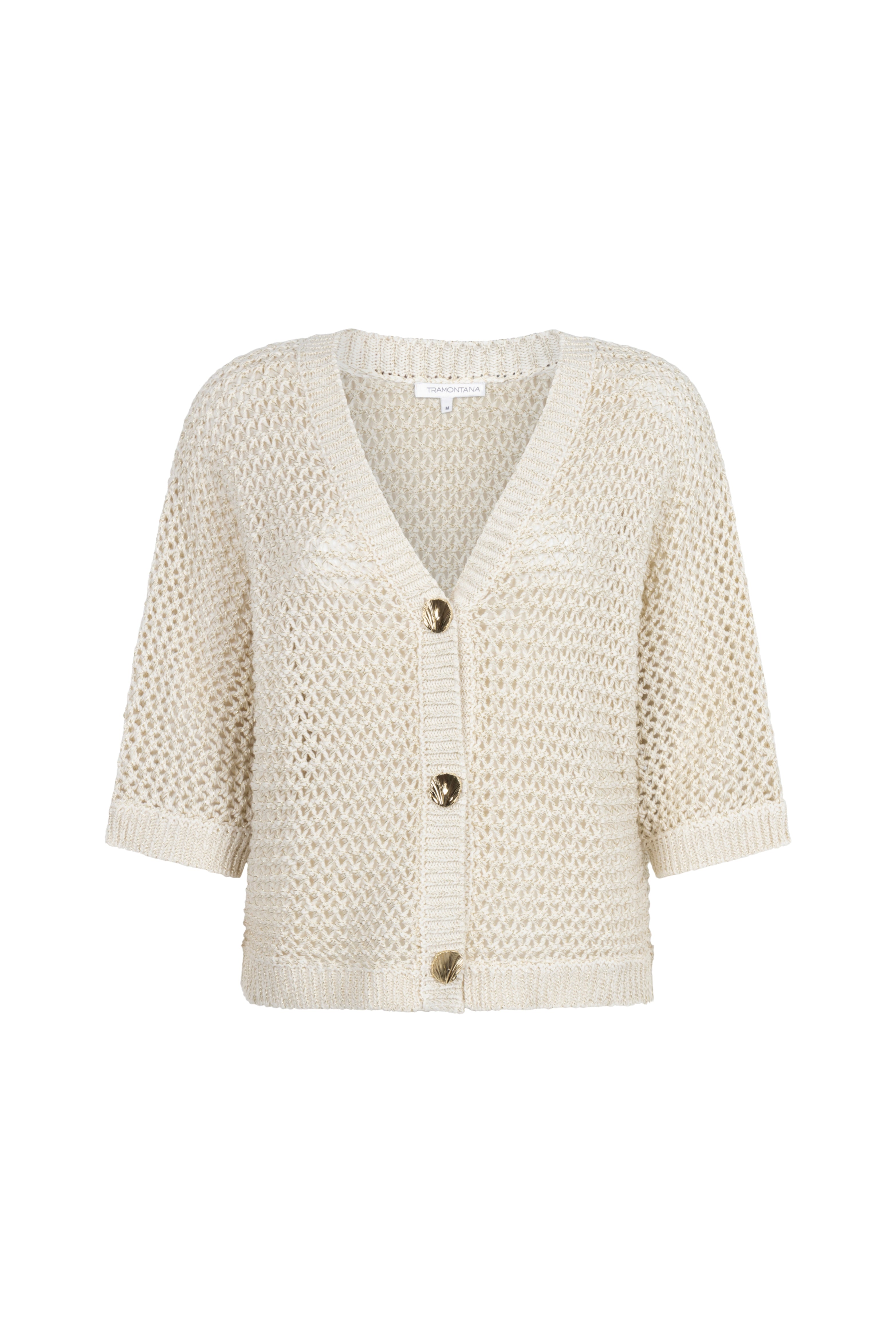 De Vest V-Neck Crochet Stone van Tramontana is een luchtig gehaakt vest met V-hals. De opengewerkte crochetstructuur en decoratieve knopen geven een stijlvolle touch en maken het item ideaal om te layeren. Perfect voor voorjaar en zomer.